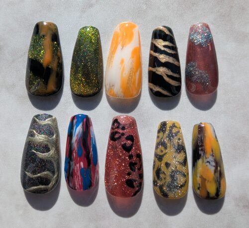 ギタリスト・飯塚昌明さん(づかさん)をイメージしたデザインは、タイガーのアニマル柄をメインに取り入れました。ブラックをベースにすることで全体を引き締めつつ、ゴールドのマグネットジェルをアクセントに使用し、ステージ上での存在感や力強さを指先で表現しています。