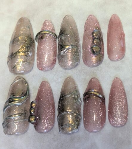 棒状に丸めたジェルにパーツを埋め込めばメタリックなアクセサリーデザインにもなります。