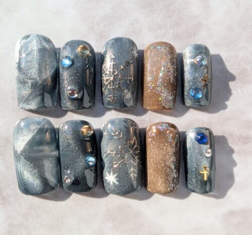 冬の夜空をそのまま閉じ込めたような、大人上品なクリスマスネイルチップが完成しました。