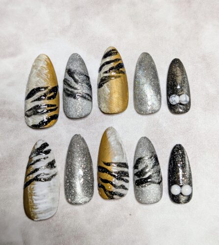 親指・中指には、ゴールドとホワイトのマットカラーをベースに、NOVERのブラックフラッシュマグで虎模様をアート。