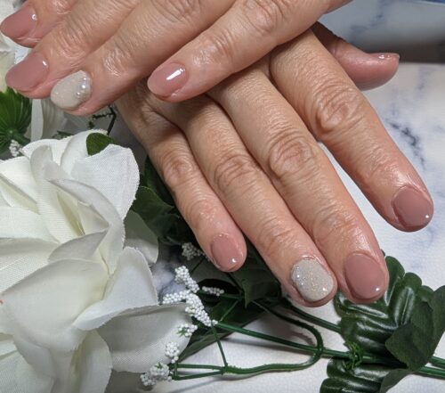 ライトグレージュの指には小粒のパールパーツを添え、仕上げにラメトップを重ねています。