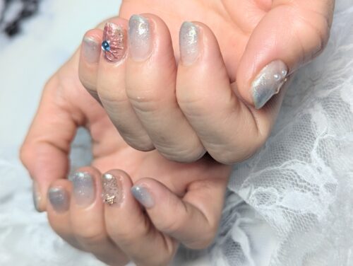 薬指にはピンクの結晶❄アートを描き、ミラーパウダーで立体的に浮き上がるように仕上げています。ポイントにはブルーカラーのパーツを添えて、全体のトーンを統一。